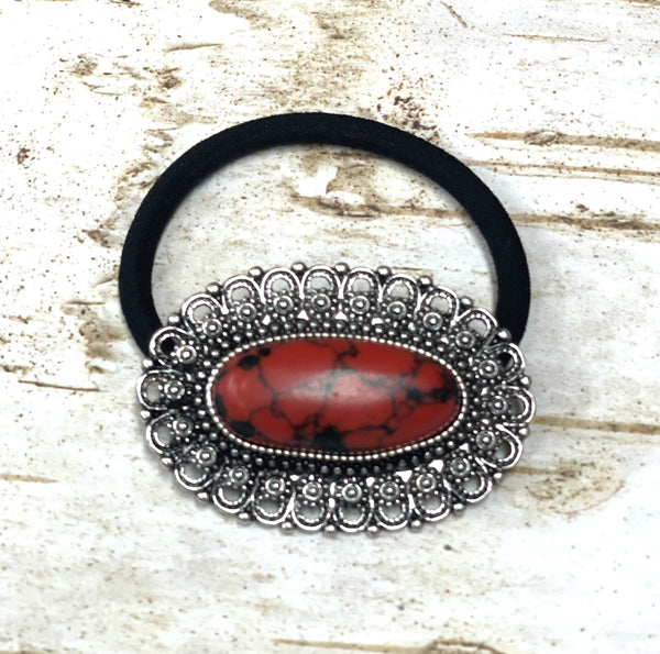 Add western flair to your hair with this oh-so-cute trendy hair tie. Burnished silvertone. Faux stone beads. Elastic band.