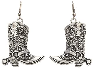 These are western-inspired earrings. Antiqued boots feature a swirl design with spurs and crystal accents. French wire dangle ear hooks. Also available with beads or color splash.