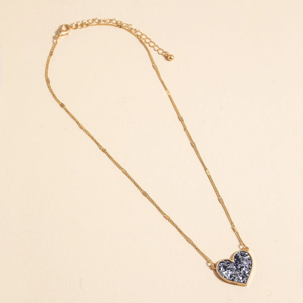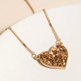 16" + 2" extension glitter heart charm necklace embellished with intricate detailing. Crafted with Zinc and Brass materials and finished in Gold plating, this necklace is lead compliant, nickel free, and designed to prevent tarnishing when kept away from wet substances and harsh chemicals.