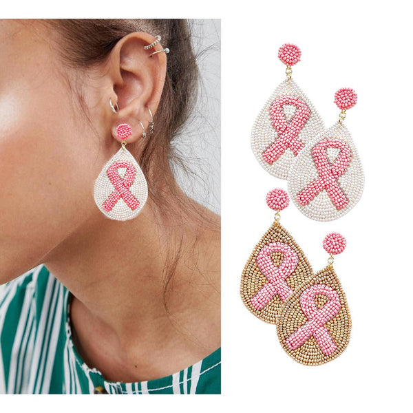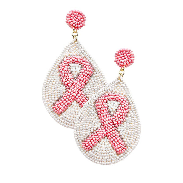 • Felt Back Seed Beaded Pink Ribbon Teardrop Dangle Earrings