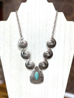 This necklace has an oval turquoise stone in the center of an Aztec written medallion.