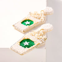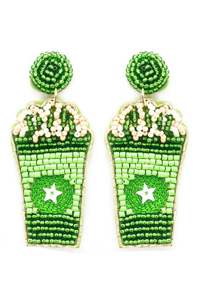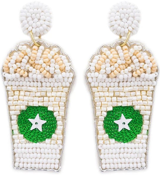 Show off your love for coffee and Frappuccinos with these adorable embellished earrings. They feature accent green threading with a sequin white star. or