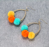 Pompom Teardrop Dangle Earrings, Multi-color and Gold Color (yellow, orange & mint pompom)