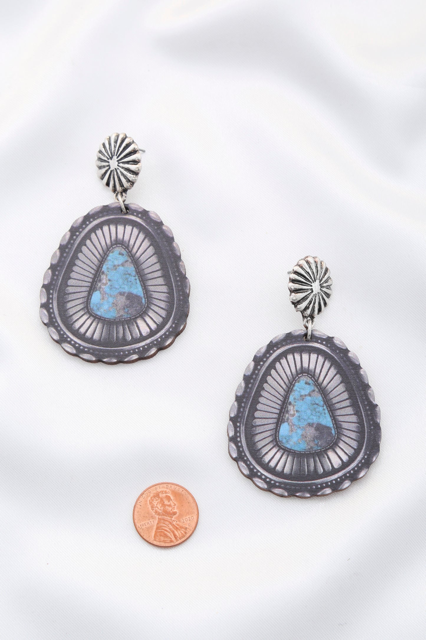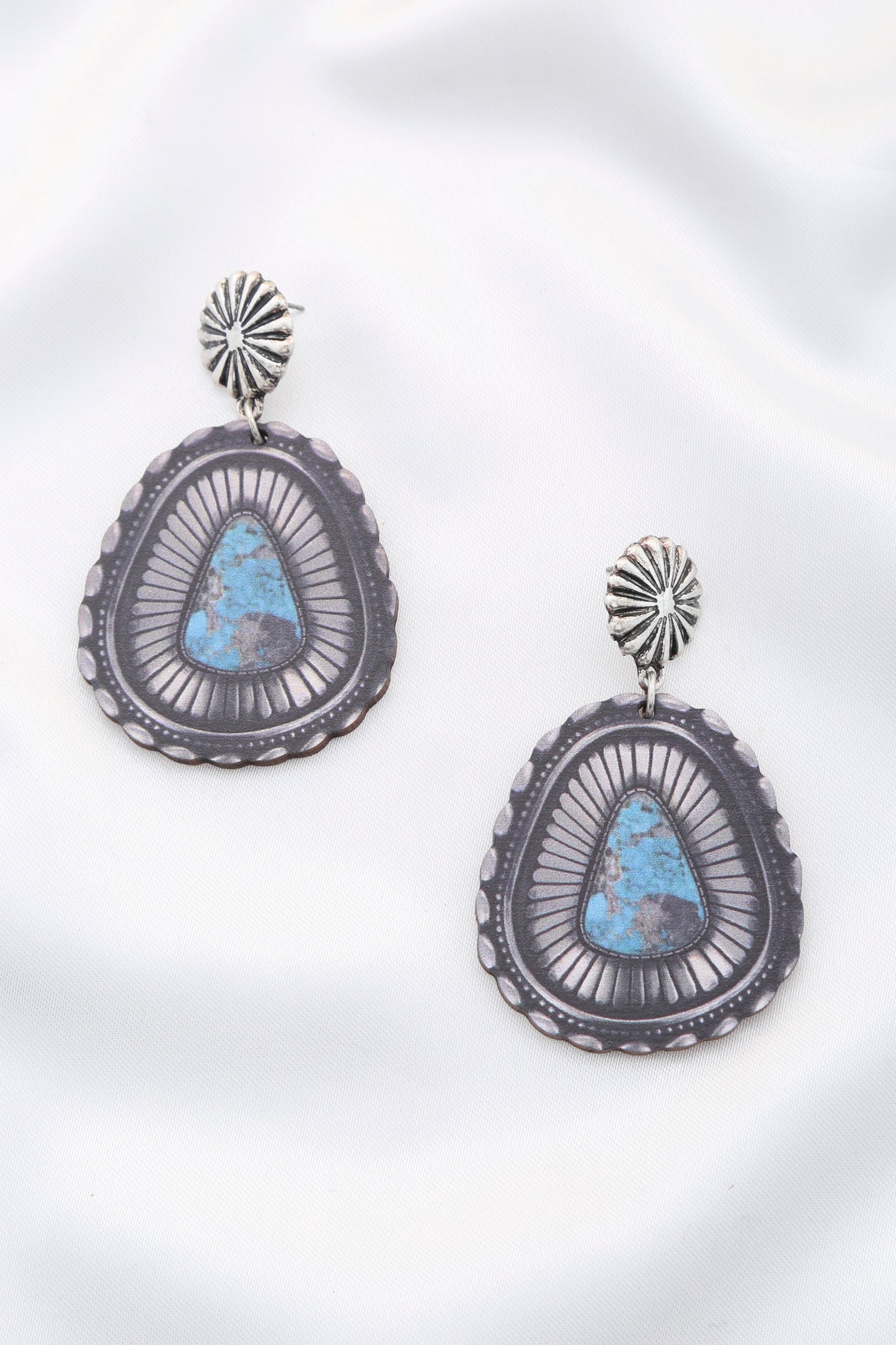 Beautifully printed western earrings on a wooden background. Very lightweight and look just like the real thing. Turquoise stone on a silver etched background.