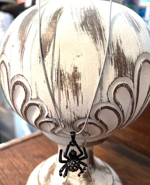 Upgrade your style with this statement Black Paved Spider Necklace, featuring a stunning spider-shaped pendant accented with black and pewter rhinestones. The chain measures 18 inches in length and the pendant is 1.50 x .75 inches, complete with a sleek silver and black finish. This necklace is lead and nickel compliant, making it both stylish and safe to wear. Perfect for a spooky night out, add a touch of sparkle and elegance to your look with this must-have accessory.