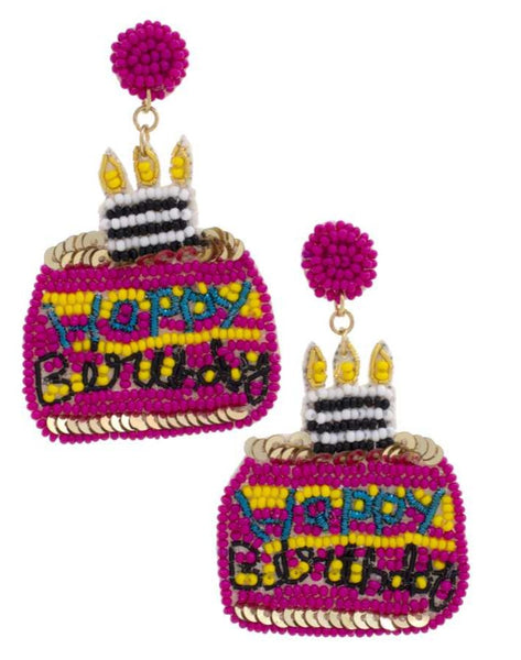 These vibrant colors are created with seed beads, tube beads, and metallic coil threading. These birthday cake earrings say exactly what you need to say on their birthday. "Happy Birthday"