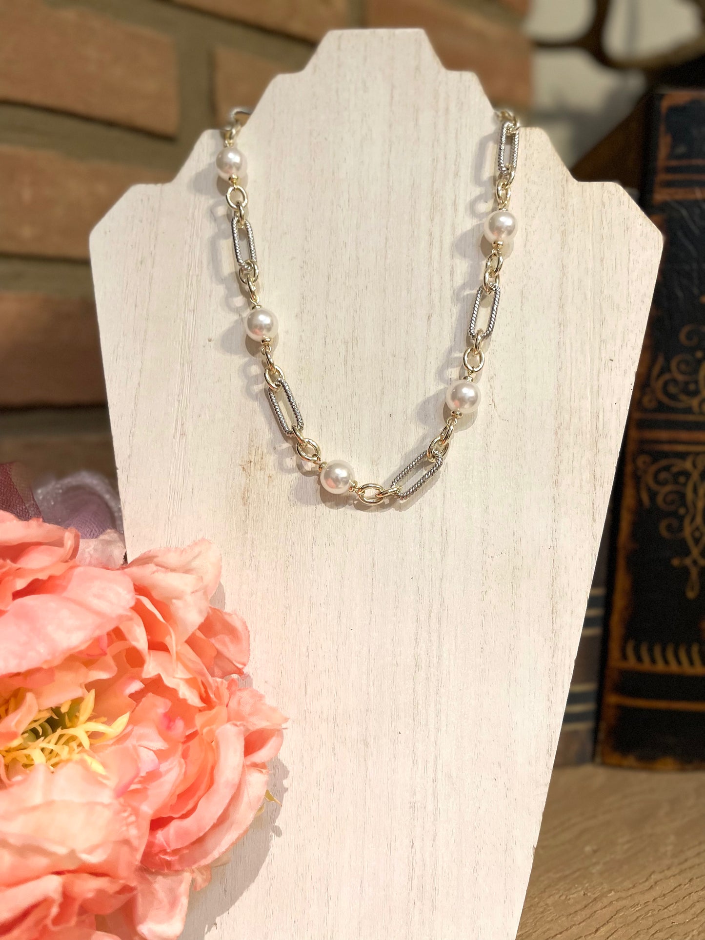 Beautifully twisted large silver links with pearls and small rounded gold links to create this beautiful piece that has a toggle for an easy on and off ability. Wear for work or wear for a special night out.