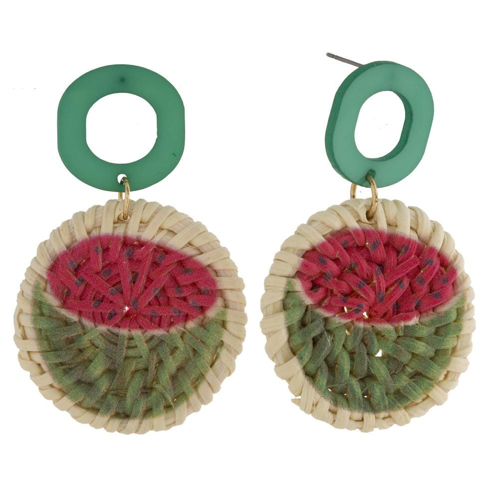 Long woven raffia earrings with acetate post and watermelon fruit print. Approximately 2" in length.